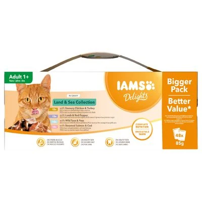 When you buy selected 48 x 85g IAMS Delights wet food for adult cats, with high quantities of meat or fish combined with tasty vegetables in an irresistible gravy or jelly, you’ll get 10% off!