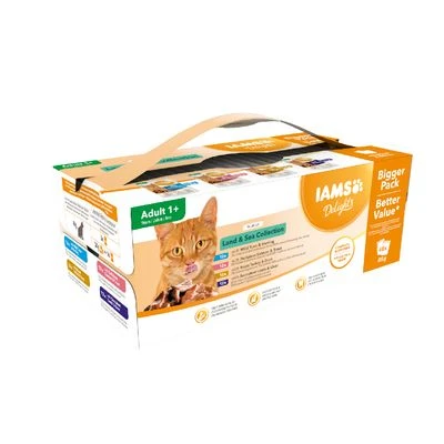The IAMS Delights Adult Land & Sea Collection in Jelly Mega Pack contains the following flavour varieties:
