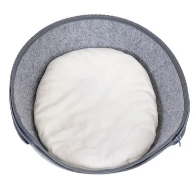 Spacious sleeping den for cats and small dogs, made from artificial felt. The top can be removed completely with a zip fastener, with a removable cuddly cushion and offering protection from draughts.