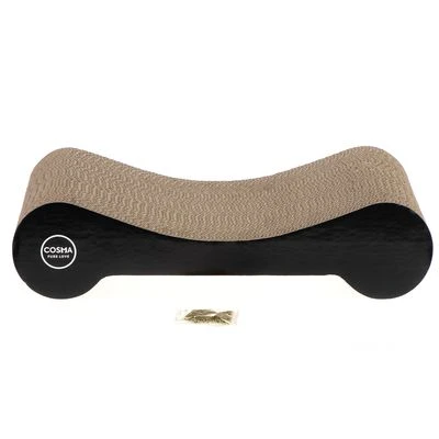The Cosma Cat Scratching Pad is the perfect piece of furniture for diva cats. This sleek scratching pad is shaped like a modern chaise longue and but it is strong enough to also withstand crazy scratch attacks. The Cosma cat scratcher is made from 100% recyclable cardboard and when one side is looking a little worn, just flip it over and it looks as good as new! On the one side the gentle curves provide a comfy dip where your cat will love to lounge. The other side is flat, with rounded ends, where your cat can rest its head and watch the world go by. It has shiny black sides, decorated with the Cosma logo. Cats love cardboard, so this cat scratching pad is bound to be very popular. But just in case there is also a little bag of catnip which you can sprinkle on the scratcher. As with all Cosma accessories, this cat scratching board has a timeless elegance and will not look out of place, whatever your décor.