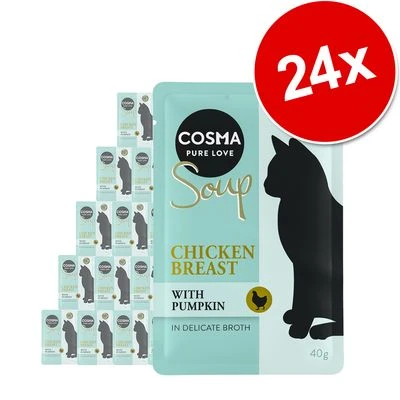 Cosma Soups with chicken, tuna or salmon in a delicate broth come in individual, portion-sized pouches and are the tasty way to show your cat how much you love it. These delicious soups are a supplementary food for cats and not only do they taste good, they are also an additional source of liquid.