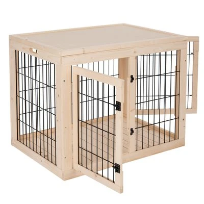 Indoor dog kennel made of wood with metal cage walls, ideal for short-term housing. With 2 entrances, sturdy roof and removable floor. With a natural wood colour that fits into any interior.