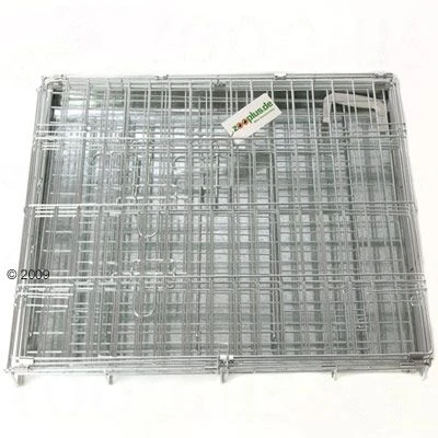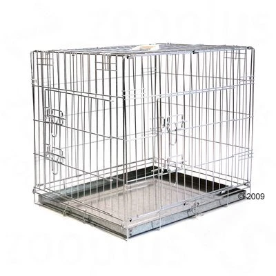 A folding crate for dogs made from stable metal and with a removable zinc-coated base tray, with two doors for easy entrance and a carry handle, and available in a range of handy sizes.