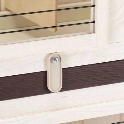 - Integrated outdoor enclosure: accessible by ramp from the upper hutch, with small sliding door at the front