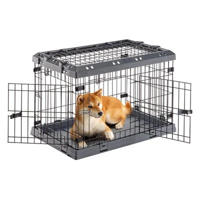 Dog cage for home or travel, stable and robust, double locking and folding roof, drainage system for dry floor, easy to fold and transport, made of metal and plastic