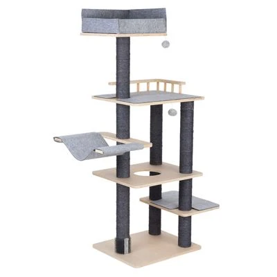 Stable cat scratching tree with long sisal posts and contrasting colours, featuring a lookout platform, hammock and comfortable bed, covered with robust artificial felt upholstery.