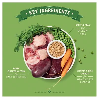 Made with real meat, delicious vegetables and enriched with vitamins and minerals, this tasty organic complete wet dog food is wheat, corn and soya free. No artificial additives.