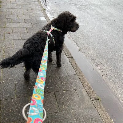 Adjustable dog lead with colourful donut print, very hard-wearing double-layered sandwich design, adjustable length, 3 D-rings, very comfortable, made of neoprene & polyester