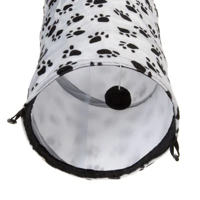 This cat tunnel is covered in soft, cosy material with a cute black paw pattern. It has a rustle layer and a little toy ball for added fun. There is a middle entrance and it folds away to save space.
