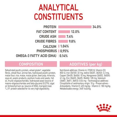 Royal Canin Kitten Sterilised has been specially developed to support the nutritional needs of sterilised cats during the “consolidation phase” of growth. This tailored food contains a reduced fat content for weight control, without compromising on levels of protein, calcium and phosphorus to ensure ideal development. Royal Canin Kitten Sterilised also contains nutrients such as vitamins C and E, which support the development of a healthy immune system. The kibble is also enriched with omega-3 fatty acids (DHA) to promote brain development and healthy eyesight.