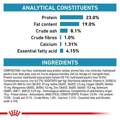 This dietetic Royal Canin Veterinary Dog – Hypoallergenic Puppy contains highly hydrolysed protein sources, which have a low allergenic potential and can reduce the risk of intolerance. It also contains rice as a source of selected digestible carbohydrate. Royal Canin Veterinary Dog – Hypoallergenic Puppy also provides your dog with essential fatty acids to support the skin’s natural barrier.