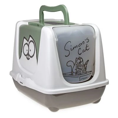 Hooded cat litter tray with a Simon’s Cat design, including fun cat images that you and your cat will love, with an active carbon filter to combat odours and a large swing door entry.