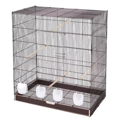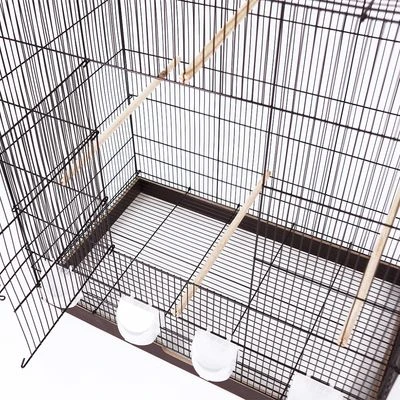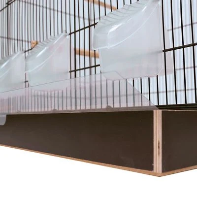 Indoor aviary for budgies and canaries, removable wooden base with plexiglass panel, large door, includes several perches and feeding bowls, collapsible, spacing between bars: 1.1cm