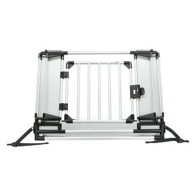 Practical dog barrier for use in the car boot, allowing you to use the boot as a dog travel kennel and easy to assemble, folding up for storage and with adjustable door height, width and angle.