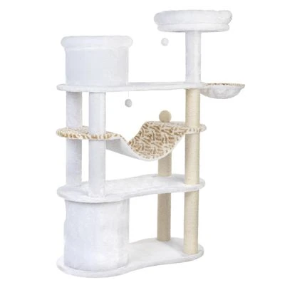 A highlight of this tree is the enormous, extra comfy hammock in the centre, which is big enough for more than one cat to cuddle up and doze on comfortably. The hammock has an eye-catching white tiger stripe design that gives this cat tree its name. On the highest platform, your cat will find a roomy den with a cosy bed built into the top. Your kitty is sure to make the most of this area, which is perfect for having a snooze or looking out over the surroundings.